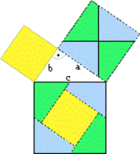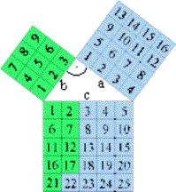 Einzeichnen der EinheitsquadrateAuf den Seiten eines rechtwinkeligen Dreiecks (z.B. a= 3cm; b= 4cm; c= 5cm) werden Quadrate errichtet und deren Flächeninhalte verglichen. Dazu werden in die einzelnen Quadrate Einheitsquadrate (1cm2) eingezeichnet und deren Anzahl bestimmt. Wir erkennen: In einem rechtwinkeligen Dreieck ist die Summe der Flächeninhalte der Quadrate über den Katheten gleich dem Flächeninhalt des Quadrats der Hypotenuse.